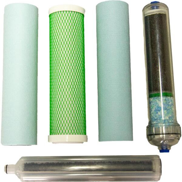 Régi típusu Azur víztisztítóhoz kompatibilis betét. 5 db-os szűrőbetét készlet AZUR víztisztítóhoz: 1. lépcső: Ezüsttel impregnált mechanikai szűrő 5 mikron 2. lépcső: Kókuszhéj alapú aktívszén előszűrő 3. lépcső: Ezüsttel impregnált  mechanikai szűrő 1 mikron 4. lépcső: KDF+GAC központi szűrő 5. lépcső: Ezüsttel impregnált kókuszhéj alapú aktívszén utószűrő A magnetizáló/mágneses patront tartalmazó szűrőkön a magnetizáló patront nem kell cserélni, a többi szűrő cseréje után ugyanúgy vissza kell helyezni!   Kar bantartás: Célszerű 6-12 havonta cserélni a szűrőbetéteket.  Ezt nagyban befolyásolja a bejövő víz minősége!